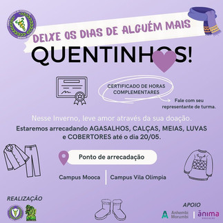 Para somar forçar nesta corrente do bem, a Atlética HYDRA, do curso de Fisioterapia, organiza uma campanha do agasalho nos campi Vila Olímpia e Mooca, que vai até o dia 20/05, em parceria com o Centro Acadêmico de Fisioterapia Deborah Varjabedian da UAM:
